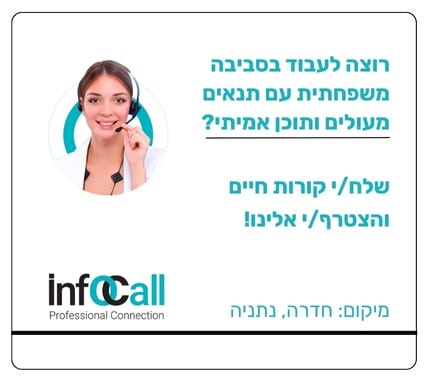 אינפוקול חברה המתמחה בניהול מוקדי שירות ומכירה, דרושים /ות נציגי /ות טיוב לידים למוקד בוטיק מהמם וחדש בתחום הביטוח. הצטרפו אלינו ותהנו משעות עבודה נוחות ללא משרות ערב – מתאים גם לאמהות. אפשרויות קידום נרחבות ערבי צוות ימי כיף ונופשי חברה. תחרויות, פרסים…